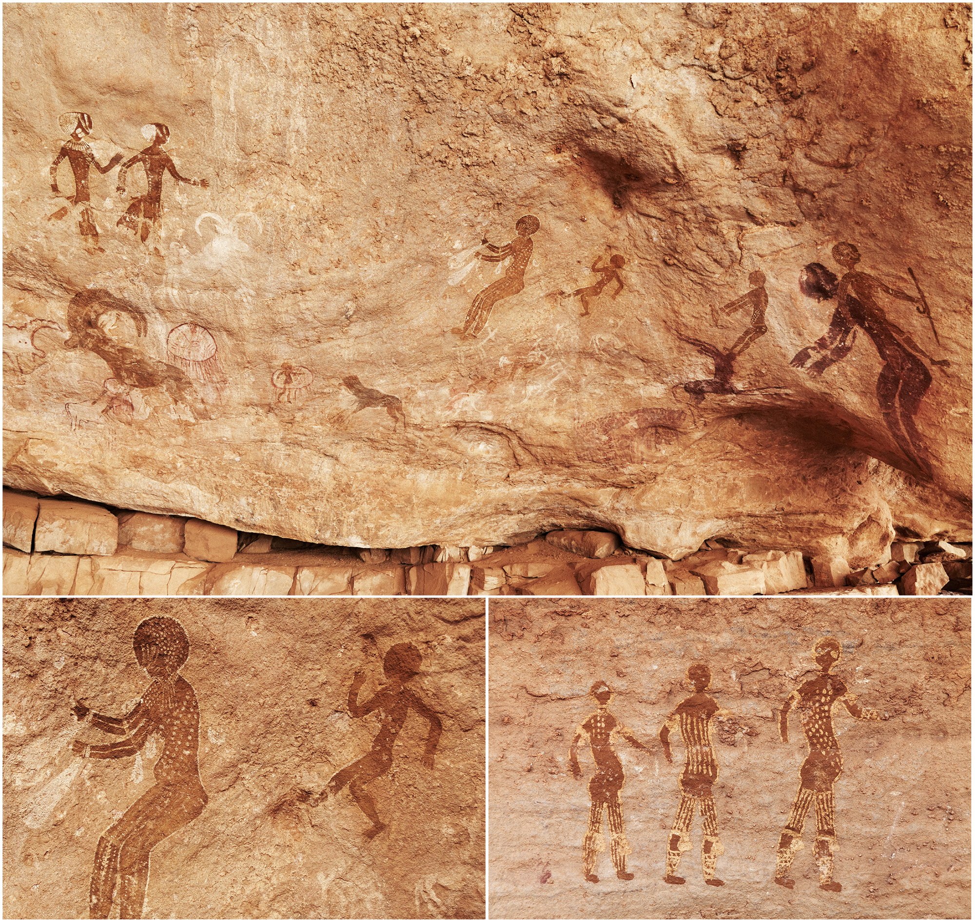 1. حقبة الرؤوس المستديرة (قبل 5000 ق.م): تتميز برسومات بشرية ذات رؤوس مستديرة وعين واحدة، يصل طول بعضها إلى 3 أمتار. الباحثين فسروها ككائنات فضائية، بينما يرى آخرون أنها تمثل أقنعة طقوسية.