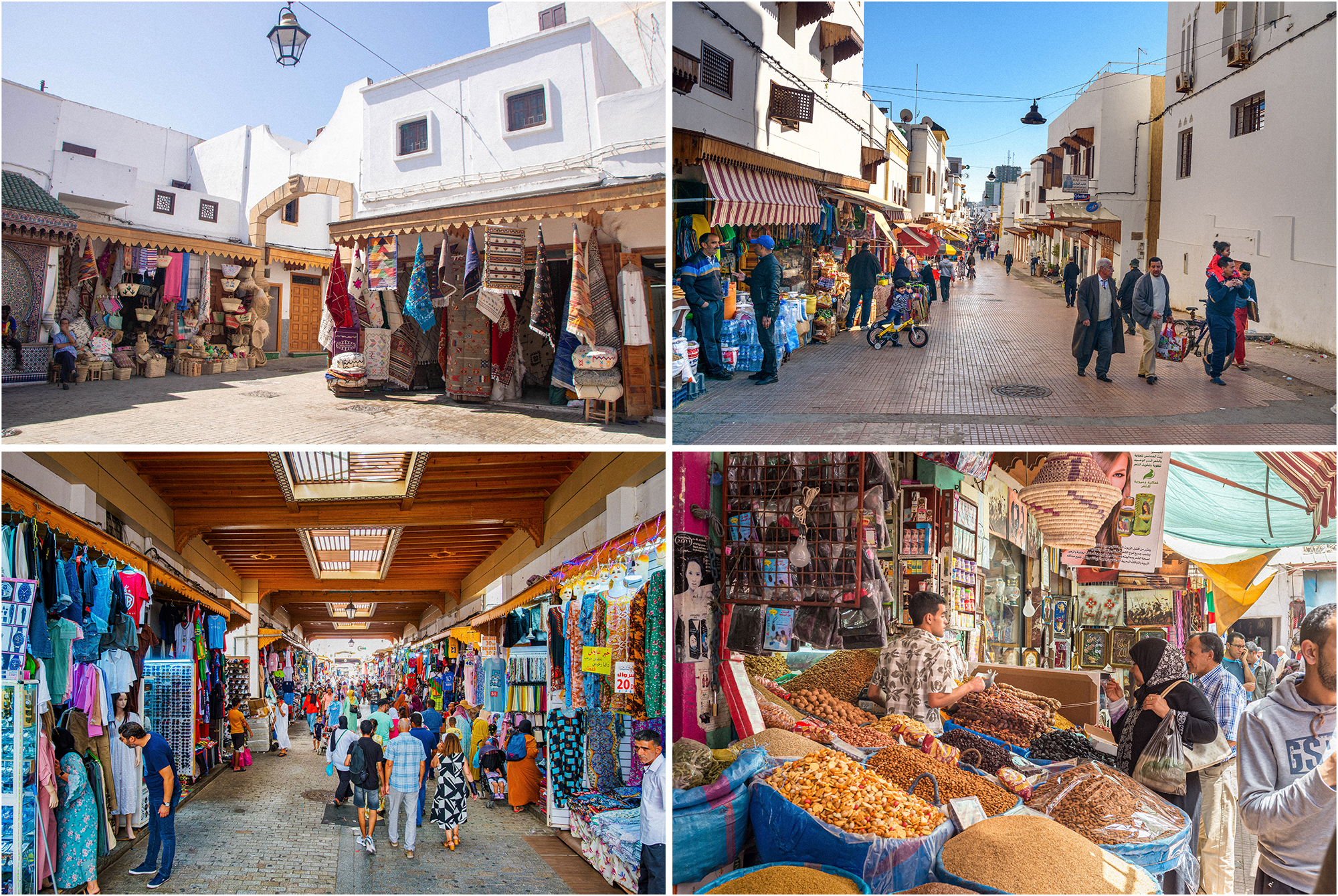 وأنت في عاصمة الأنوار مدينة الرباط المغربية، في شريانها الرئيسي شارع محمد الخامس، حيث التراث المعماري الكولونيالي بارز في واجهات العمارات العالية، وفي برلمان المملكة وفندق ومقهى باليما الأسطوري مسافر عبر مظاهر الحداثة والعصرنة، وغير بعيد ترمي بك الخطوات المتسارعة في وسط المدينة العتيقة؛ لتأخذك في رحلة عبر الزمن، رحلة عبر التاريخ تأسر الأفئدة وتستهوي النفوس، حيث عبق التاريخ وحركة الناس الدؤوبة ذهاباً وإياباً، إنك في أسواق الرباط التقليدية العتيقة، والتي تعد تراثاً حضارياً ذي إشعاع عالمي، حيث التحف المعمارية والرموز الناطقة عن التطور المعماري الذي عاشته المدينة: قباب من الآجر التقليدي، جدران سميكة، دكاكين بأبواب خشبية موحدة الشكل والهندسة على الجانبين، فتحات في الأسقف. ومن أهم أسواق الرباط العتيقة، نذكر:
