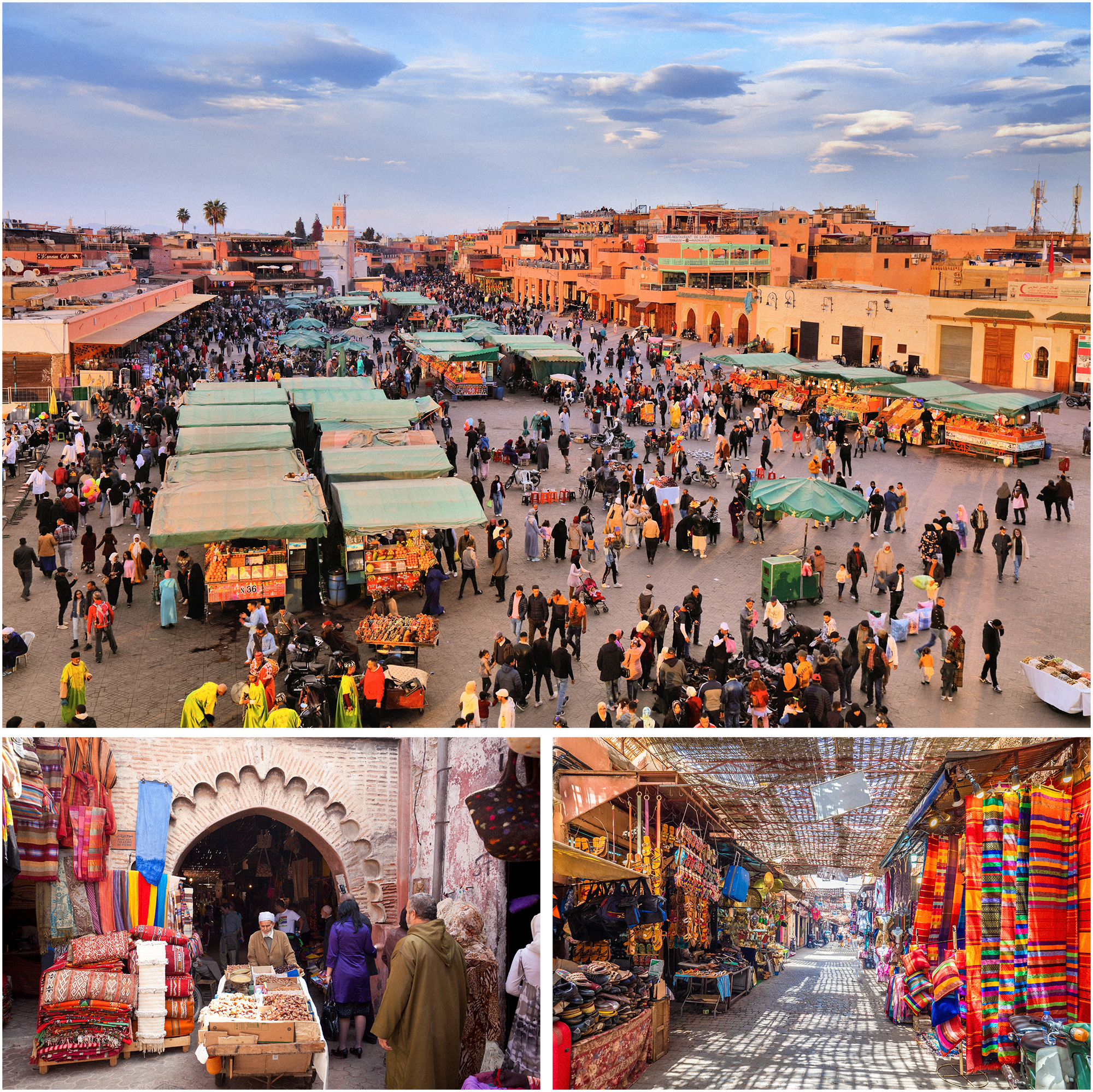 أما أسواق مراكش، فقد شهدت فترة ازدهار حضاري واقتصادي، وذاعت شهرتها في عهد المرابطين والموحدين وامتدت إلى يومنا هذا. فلاكتشاف عالمها ما عليك بعد الاستمتاع بأجواء ساحة جامع الفنا، بحلقاتها وحكايات الحكواتيين ومروضي الأفاعي والقردة والروائح المنبعثة من أكلات عربات البائعين، إلا زيارة أسواقها التقليدية والتي تنطلق من السوق المركزي، كالرحبة القديمة، وهي مكان لبيع مختلف أنواع الحبوب والتي ارتبطت بفترة الموحدين، بجواره يوجد سوق الغزل الذي كان سابقاً سوقاً للعبيد والذي اندثر بظهير فرنسي، وبالمدينة أسواق سميت باسم الحرف التي كانت تمتهن بها، كسوق السراجين والبرادعين والقشابين، وسوق السمارين الذي يضم دكاكين تجارية وحرفية ارتبطت به منذ ظهوره في بداية القرن 19 كصناعة الحلي والجلد والحدادة، في هذا السوق تشكيلات من المنتجات الجلدية والأثاث والملابس والحقائب والديكورات، تعبر عن إبداع الصانع المغربي. أما سوق الملاح أو العطارين، لا يبعد عن ساحة جامع الفنا إلا بخطوات وقريب من معلمتين تاريخيتين هما: القصر البديع وقصر الباهية، وهو خاص بمنتجات المواد العطرية والتوابل والمكونات الخاصة بوصفات الجمال الطبيعية التي تعتمدها المرأة المغربية.