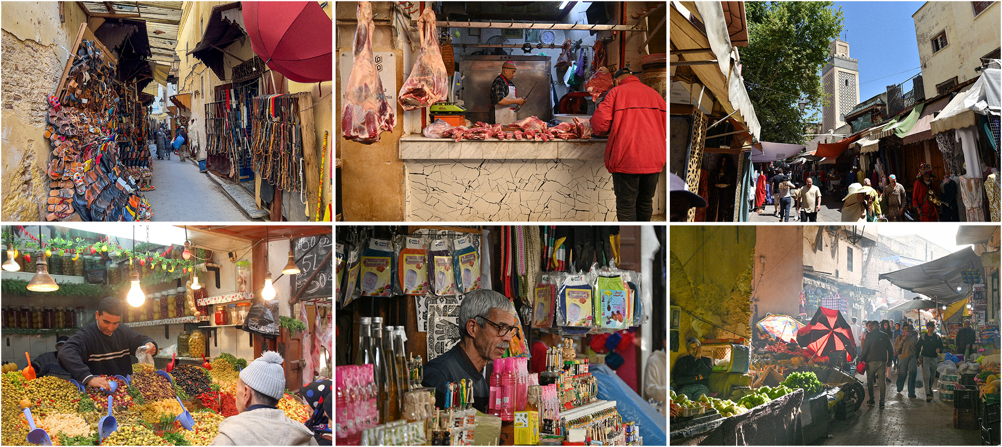 لا تخلو فاس العالمة كذلك من الأسواق التقليدية، بل هي تمثل جزءاً لا يتجزأ من تاريخ المدينة، فقد نالت أسواقها اهتماماً كبيراً خلال حكم الأدارسة والمرابطين والموحدين. فالمهن منظمة لكل حرفة سوقها، وذلك تسهيلاً لأمين كل مهنة في مراقبة أبناء مهنته كسوق الدباغين والنجارين والصفارين. وتعرض في أسواق مدينة فاس العتيقة المنتوجات التقليدية كالحلي والفسيفساء والزرابي والمفروشات واللباس التقليدي، وتشهد مبيعات الملابس التقليدية والعصرية والصناعات المحلية النفيس منها والرخيص رواجاً في أسواق المدينة العتيقة بفاس، فمتاجرها مفتوحة طيلة اليوم لمن يبحث عن شيء يشتريه، ولمن تستهويه هواية السفر عبر التاريخ في دروب المدينة القديمة، لما تحمله بناياتها وأزقتها ومتاجرها من حمولات ثقافية وحضارية وتاريخية، تختصر الحياة الاجتماعية والاقتصادية والسياسية للناس الذين تعاقبوا على سكنها وممارسة أنشطتهم بها.